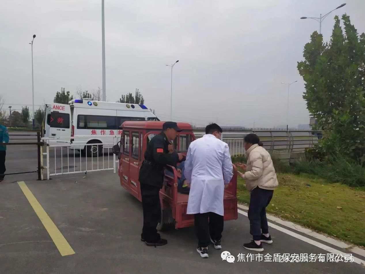 11月4日10时50分,人防三部三区驻大沙河执勤保安班长张小健巡逻至示范区文昌街道朱庄段沙河南堤中原路桥东约800米处,遇到一名女游客求助。经了解,原来其丈夫在不远处因攀登土坡,将腿骨扭伤,疑似骨折。得知情况后,张小健立即上坡将伤者背下,并迅速用三轮车将其送到中原路桥口,待120救护人员赶到后,协助医护人员用担架将伤者送上救护车。保安员张小健的行为受到伤者家属及周边群众的好评。