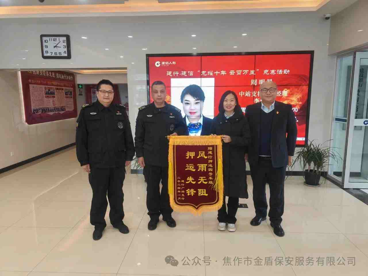 1月19日下午,押运部建行守押大队收到建设银行客户送来“押运先锋风雨无阻”锦旗一面,锦旗由广场支行张行长和建行保卫部史经理送到建行守押大队手中,并对建行守押大队的优质服务表示感谢及肯定。