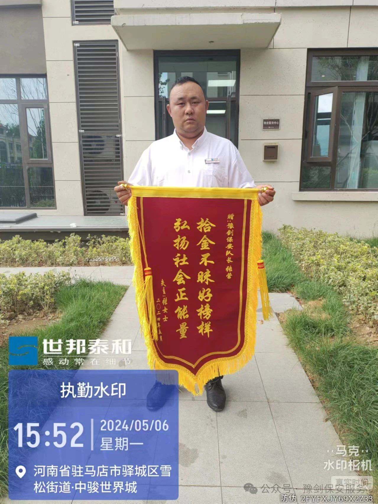 2024年5月6日,驻马店中骏世界城保安队长张营在小区巡逻时,捡到业主遗失的苹果手机一部并主动归还,受到了失主的高度赞扬。为表达感激之情,失主特地制作了一面锦旗,赠送给张营。