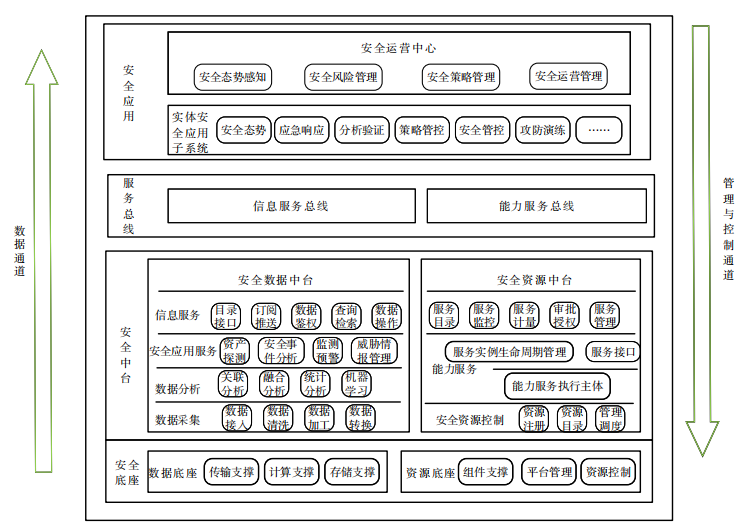近年来,业界已经提出了多种大数据安防体系建设思路,但目前,仍然处于不断地丰富和完善的阶段。研究发现,大部分安防体系设计思路主要围绕以下 4 点展开:(1)安全资源:安全策略的执行主体,对接信息通信技术(Information and Communications Technology,ICT)环境资源并提供策略执行的结果信息反馈。(2)安全资源管控系统:决策指令(安全策略)的执行传达者,通过对安全资源的能力调度及策略下发,实现“风险可控”。(3)安全信息感知系统:接收安全资源的数据,提供决策依据和决策执行的反馈信息,实现“风险可知”。(4)安全运营决策系统:基于安全信息,通过安全运行进行安全决策,实现组织安全目标“风险可管”。