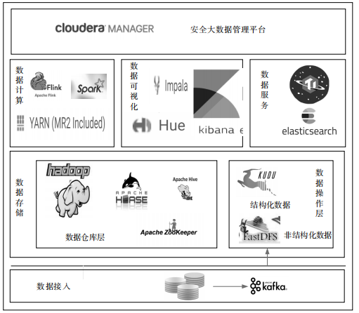 数据采集层利用大数据技术收集网络安全信息 。从业务类型来划分,接入的数据主要包括安防应用系统埋点日志类数据、流量类数据、安全资源类数据、安全知识情报类数据和安全告警类数据等。数据抽取工具和自定义程序实现对数据库、文本文件、流数据的接入。通过构建数据引接系统,支持多源异构数据接入,引入 Kafka 数据高速传输组件,能够实现流量削峰,建立高效数据传输通道,最大化数据吞吐率,实现数据高速采集传输,减少数据时延,满足对实时性要求更高的应用场景。