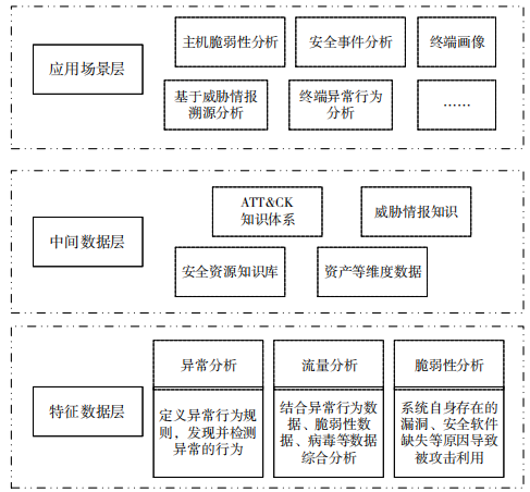 如图 7 所示,本文给出了网络安全数据挖掘分层示意图,总共包括特征数据层、中间数据层和应用场景层 3 层。