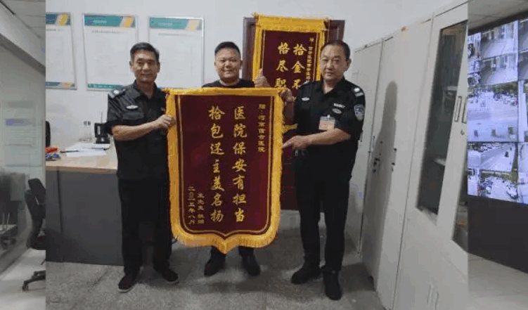 近日,信合医院发生暖心一幕,患者家属王先生专程将一面写有“医院保安有担当 拾包还主美名扬”的锦旗,送到医院保安任续林的手中,感谢他拾金不昧,及时归还自己遗失的手提包。