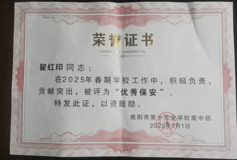 近期,南阳市第十完全学校高中部专门下文《关于表彰2024--2025学年度优秀后勤服务人员的决定》,对尽职尽责、用心服务、甘于奉献的15名后勤服务人员进行通报表彰。南阳市保安服务有限公司人防一分公司驻勤队员翟红印被评为“优秀保安”名列其中。信中说,在过去的一学年中,翟红印同志始终以高度的责任心、严谨的工作态度和无私的奉献精神,坚守在学校安全保卫工作的第一线。无论是风雨无阻地维持校园秩序,细致严格地执行出入管理,还是默默守护每一个清晨与夜晚,他都以真诚的微笑、专业的服务和无私的付出,赢得了全校师生的一致尊敬与信任。