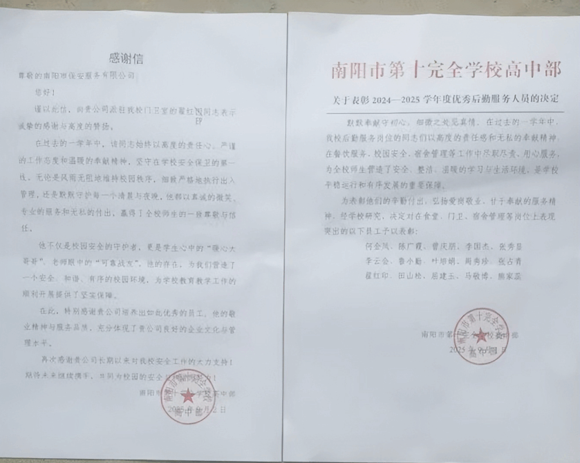 南阳保安: 恪尽职守受表彰 校方又送感谢函