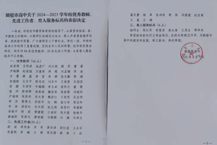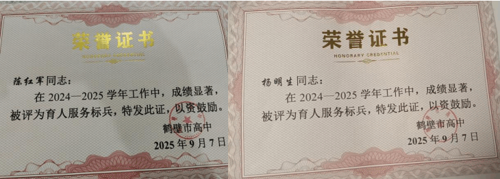 日前,鹤壁市高中开展了 2024 - 2025 学年校优秀教师、先进工作者及育人服务标兵评选活动,我公司驻鹤壁市高中服务的陈红军、杨明生两名保安员凭借出色的工作表现,荣获“育人服务标兵”称号,并受到该校表彰。这不仅是两位员工个人的荣誉,更是公司服务质量与专业形象的有力彰显。