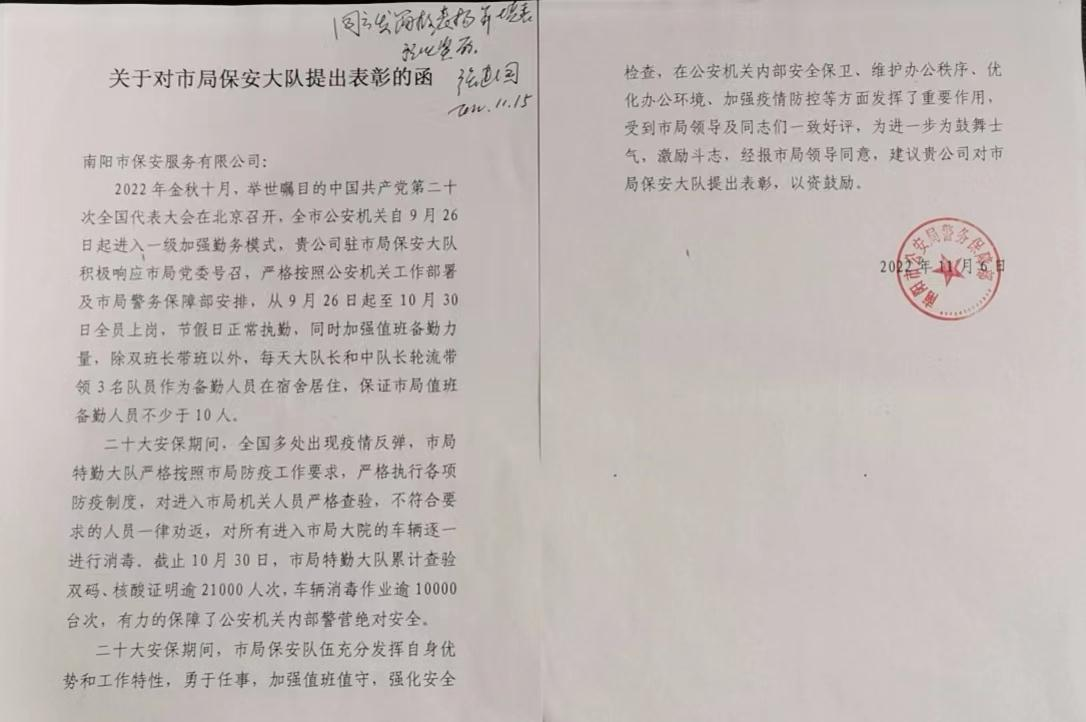 日前,南阳市公安局警务保障部致函(《关于对市局保安大队提出表彰的函》)市保安服务公司,对市局驻勤保安大队在安保工作和疫情防控工作中的尽职尽责,突出表现给予了充分肯定和好评。保安公司党委书记、总经理张建国亲自批示,对市局驻勤大队的突出事迹予以通报表扬,并按照相关规定予以奖励。