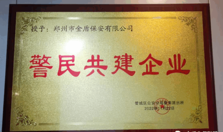 2022年11月,郑州市公安局管城分局紫荆山南路派出所向郑州金盾保安有限公司颁发荣誉证书及警民共建企业牌匾,表彰郑州金盾保安有限公司在警民共建工作中,为创建平安管城作出的突出贡献,并鼓励郑州金盾保安有限公司全体人员再接再厉,维护社会大局平安稳定,警民携手共建平安和谐郑州。