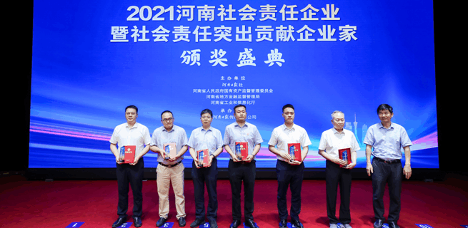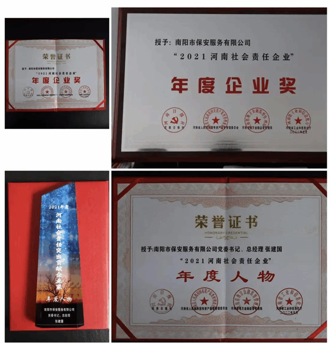 2022年7月2日,由河南日报社、省人民政府国有资产监督管理委员会、省地方金融监督管理局、省工业和信息化厅联合主办的"2021河南社会责任企业及社会责任突出贡献企业家"推选活动颁奖典礼在郑州举行。南阳市保安服务有限公司被授予"社会责任企业"称号,公司党委书记、总经理张建国荣获"突出贡献企业家"称号。