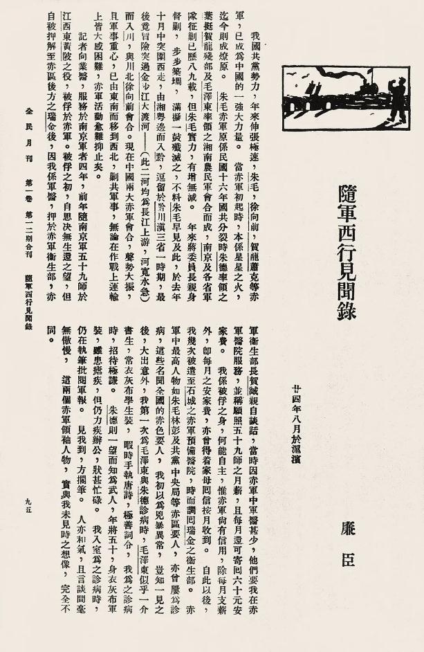 此文最早于1936年3月在中国共产党主办的巴黎《全民月刊》上连载,全文约3万字。同年7月,在莫斯科出版单行本,成为第一本介绍当时鲜为人知的中国工农红军长征的书 。