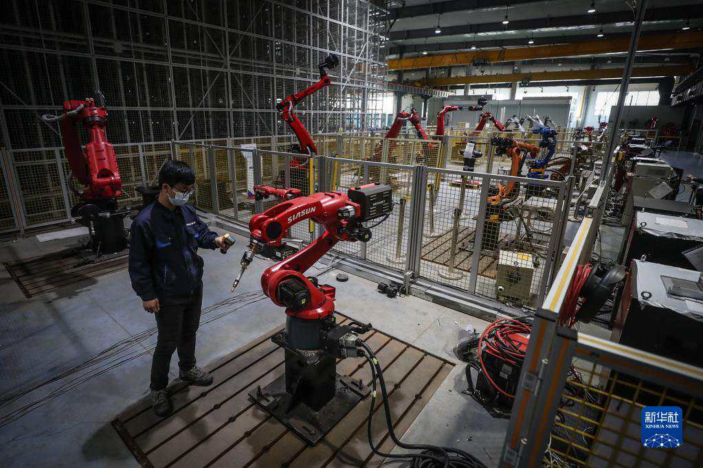 2022年4月28日,新松机器人自动化股份有限公司的工作人员在生产车间内调试机器人。新华社记者 潘昱龙 摄