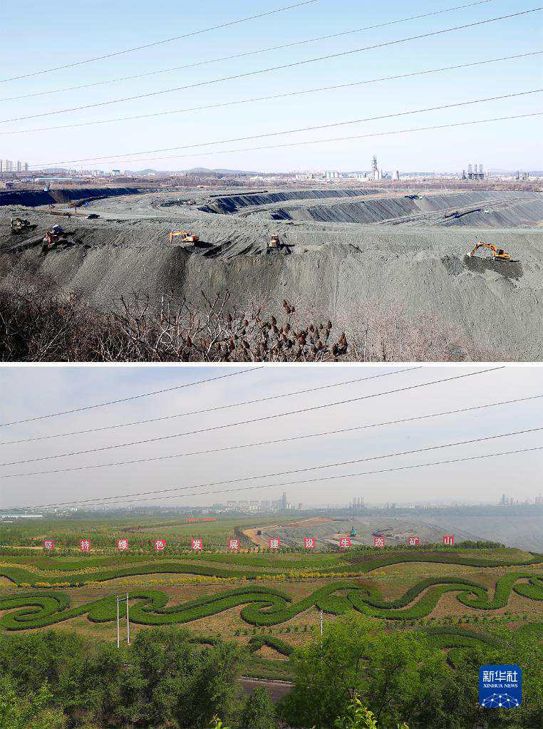 这是一张拼版照片:上图为辽宁省抚顺市西露天矿部分区域生态恢复前的场景(2019年3月6日摄,资料照片);下图为2022年6月2日拍摄的辽宁省抚顺市西露天矿部分区域生态恢复后的场景(新华社记者杨青摄,无人机照片)。新华社发