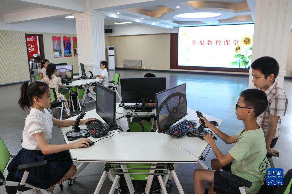 2022年8月18日,孩子们在沈阳市牡丹社区幸福教育课堂学习固定翼模拟飞行课程。新华社记者 王乙杰 摄