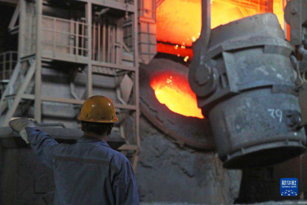 2021年8月18日,在本钢板材炼钢厂,炼钢作业区工人在进行转炉冶炼作业。新华社记者 杨青 摄