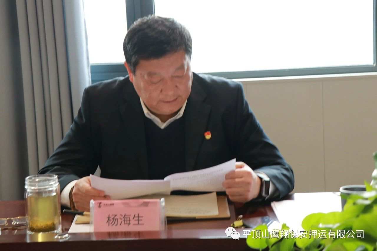 按照市委组织部和中共平顶山交通水利建设投资有限公司委员会(以下简称“交水投公司党委”)要求,2023年2月16日上午,平顶山鹰翔保安押运有限公司(以下简称“平顶山鹰翔”)召开2022年度组织生活会,深入查摆班子和个人存在的问题和不足,深刻剖析思想根源,明确努力方向和整改措施。交水投公司党委委员、副总经理温海滨专程莅会指导,平顶山鹰翔党总支书记、总经理杨海生,平顶山鹰翔党总支副书记、副总经理吴昊,平顶山鹰翔党总支委员、工会主席孙红声及经营管理团队党员干部参会。会议由吴昊主持。