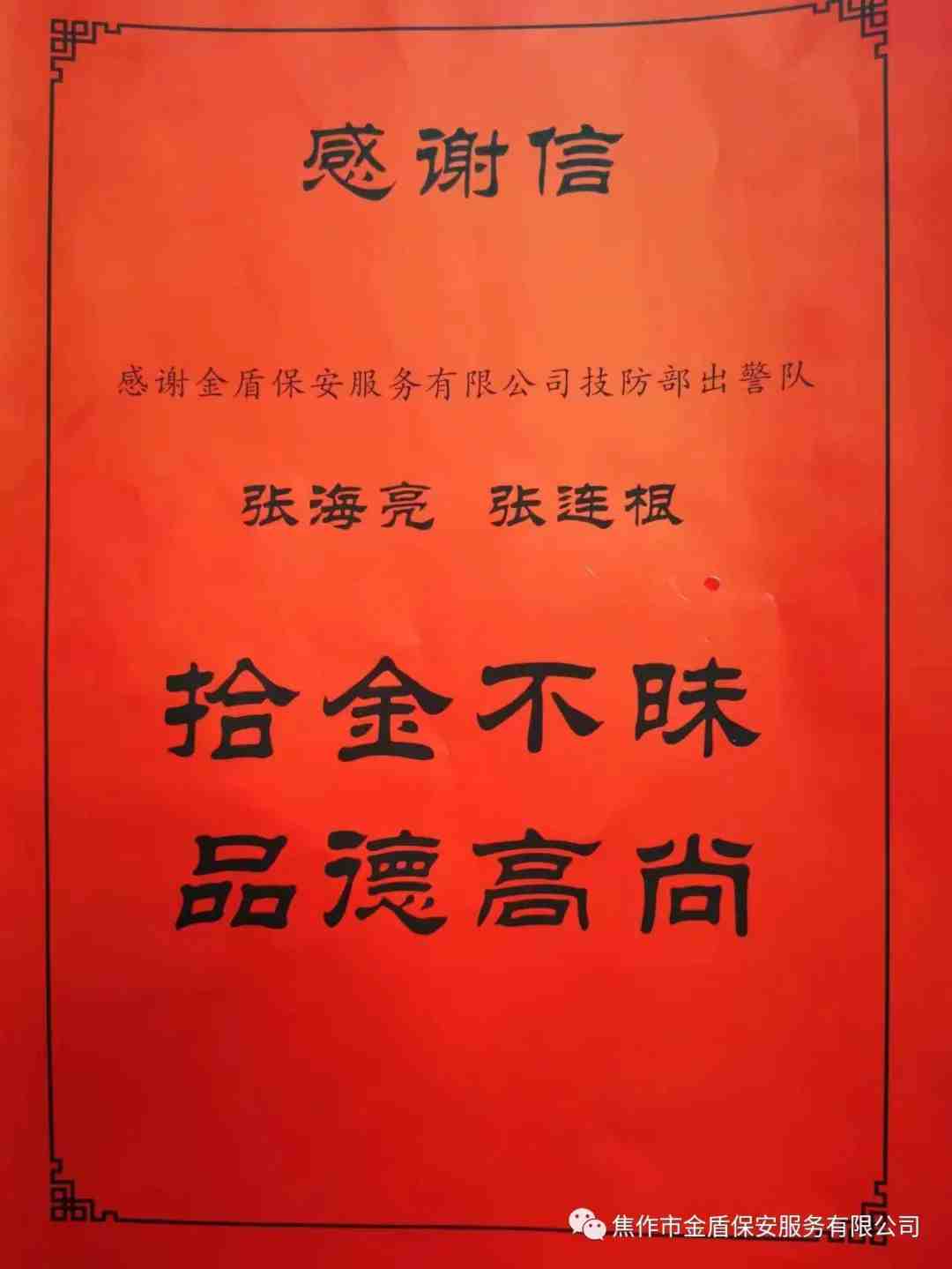 同时,两名出警人员认真负责、拾金不昧的精神受到银行主管领导的称赞,也为公司树立了良好的保安形象。