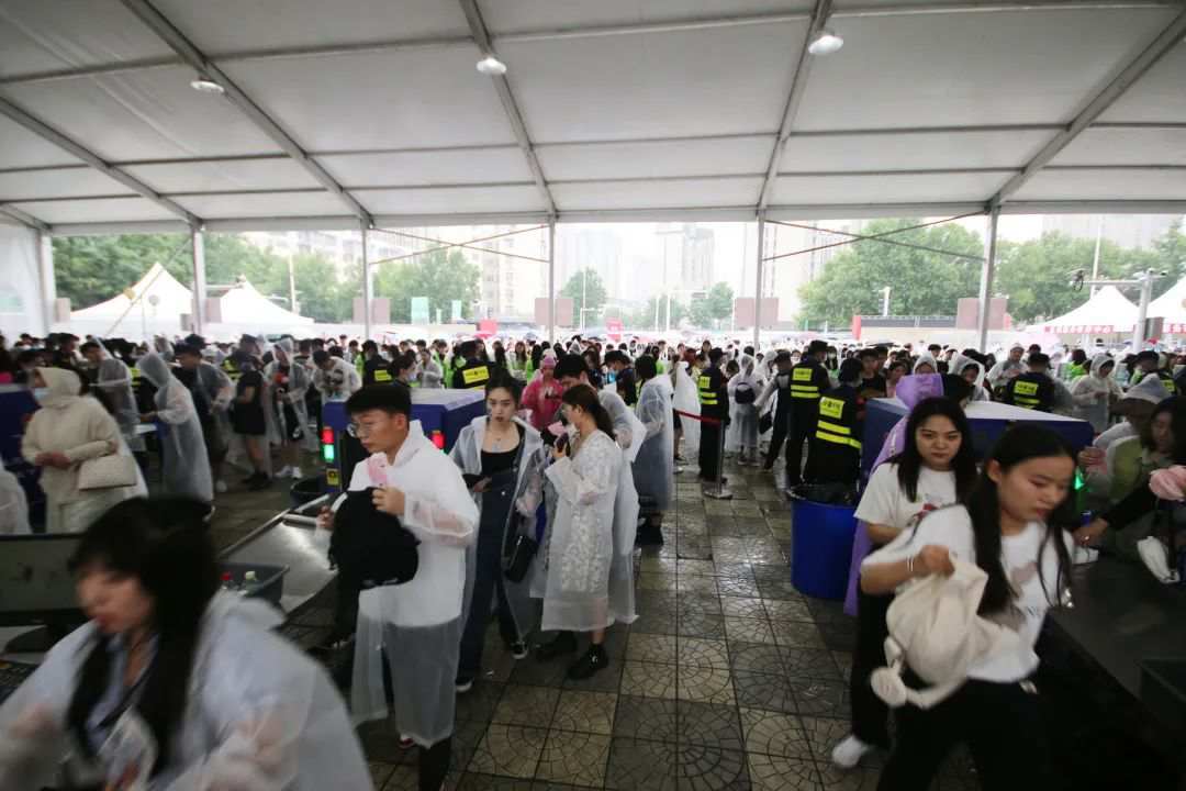 演唱会当天,安检团队提前到岗,针对周末人流量大且集中、阴雨天气人员过检易出现拥堵等特点,公司及时调整部署,全力协助主办方做好过门安检、物品检查等工作,保证了现场观众有序入场。
