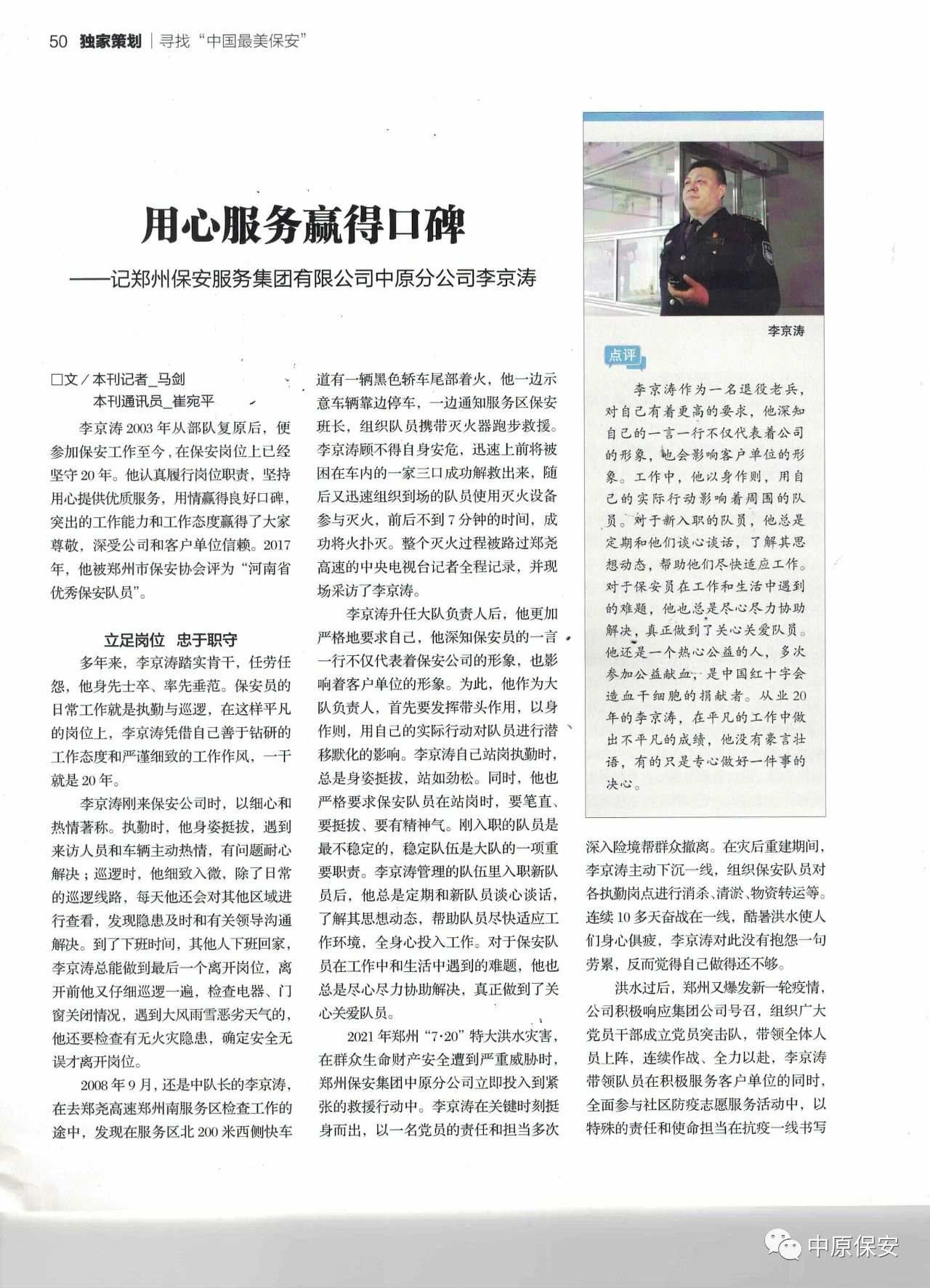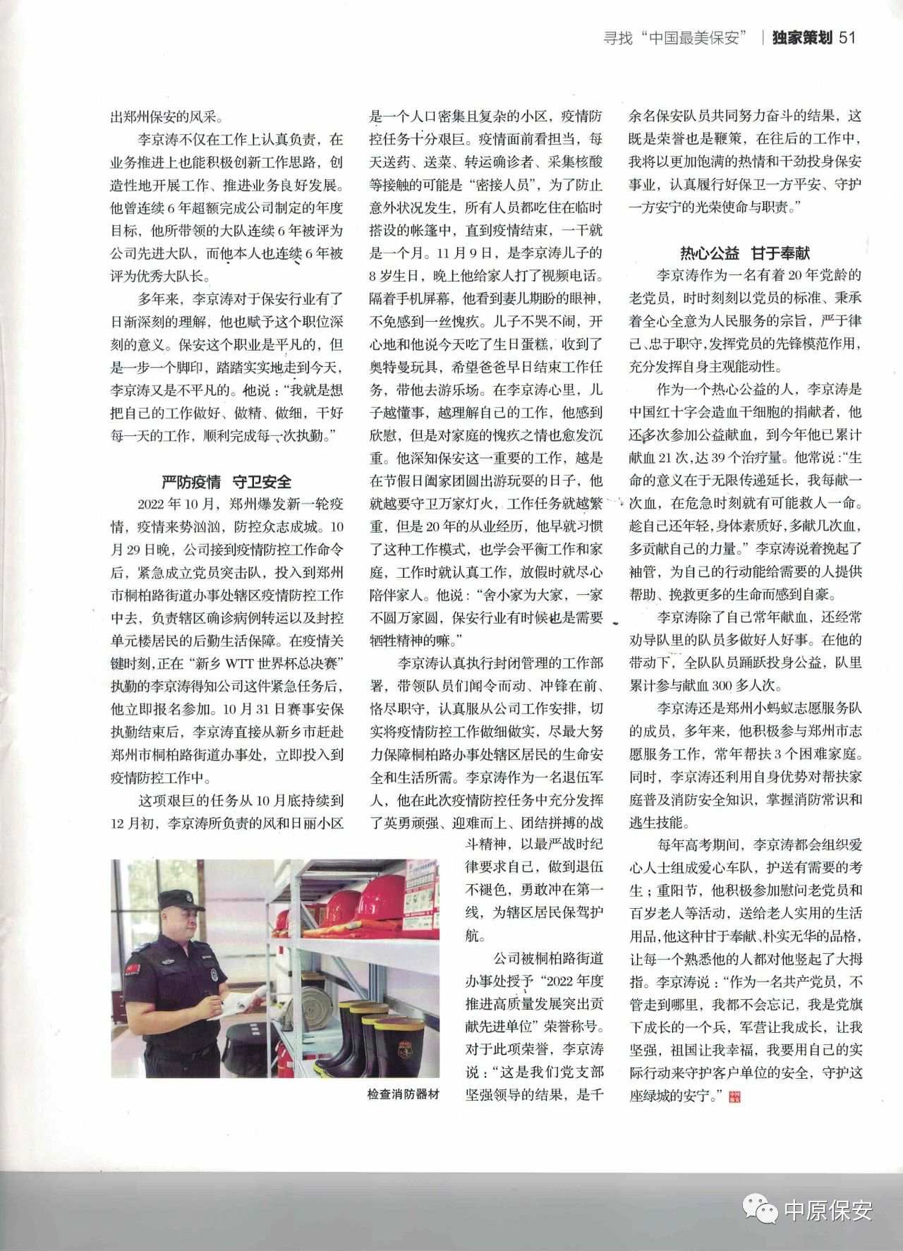 由公安部主管、中国保安协会主办的《中国保安》杂志于2023年第2期独家策划寻找“中国最美保安”栏目,报道郑州保安集团中原分公司李京涛先进事迹,展现坚守平凡岗位上不平凡的力量。现原文转发。