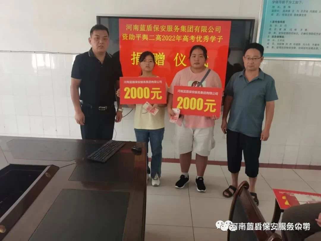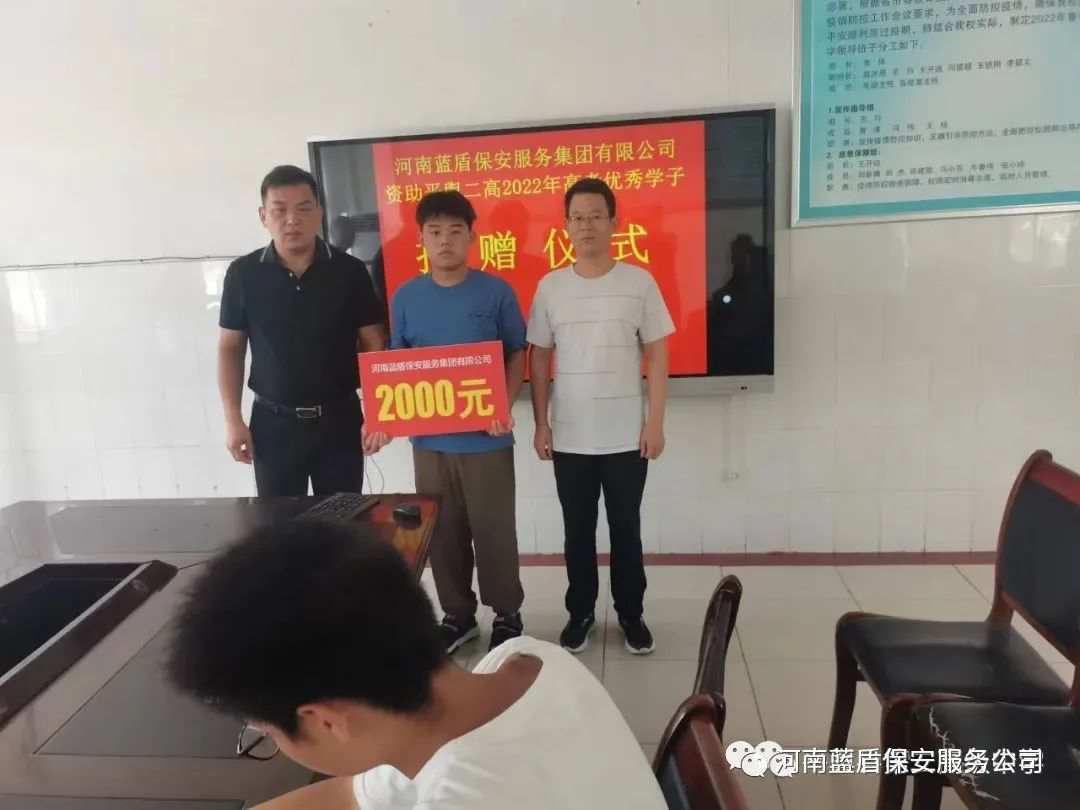 2022年8月20日上午,爱心企业——河南蓝盾保安服务集团有限公司到我校开展爱心助学捐赠活动,向平舆二高2022届优秀学子进行捐赠。副校长闫留超出席捐赠仪式,优秀学子及其班主任参加仪式,捐赠仪式由2022届年级主任王振乾主持。