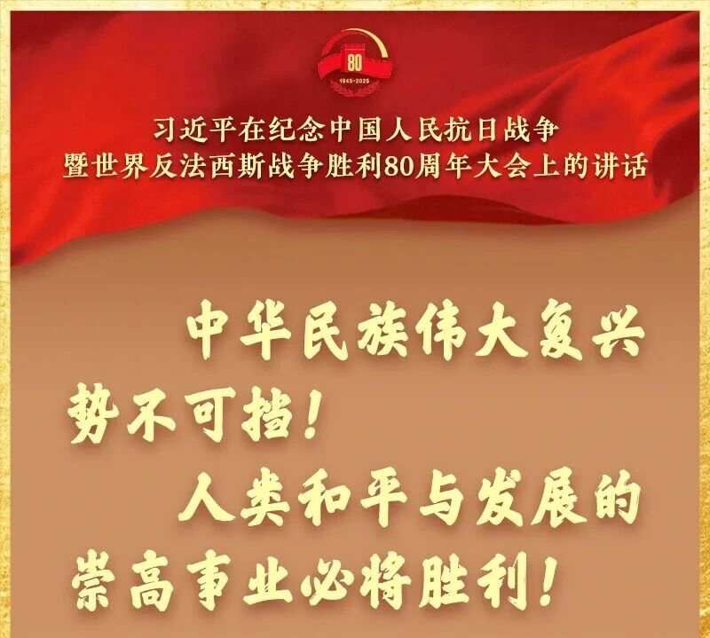 80年峥嵘岁月,见证了中国人民14年浴血奋战的伟大胜利。历史庄严昭示:人民必胜!和平必胜!正义必胜!这场用鲜血和生命铸就的胜利雄辩地证明,任何侵略行为都必将被历史的洪流所淹没,任何正义事业都必将获得最终的胜利。和平来之不易,警钟必须长鸣,我们要永远铭记这段用生命和热血写就的历史篇章。