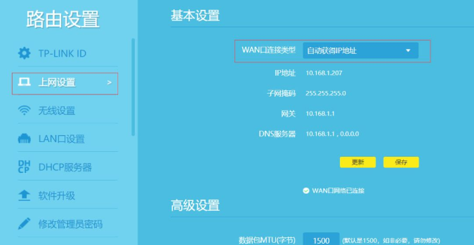 这里面可以看到,路由器2的wan口自动获取的ip地址是10.168.1.207,和我们的主路由器10.168.1.1是在同一个网段的。