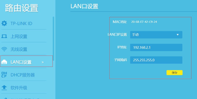 在路由器2的设置界面,点击“LAN口设置”——>右侧“LAN口IP地址选择:手动“,修改为:192.168.2.1——>点击“保存”,之后会提示重启路由器。