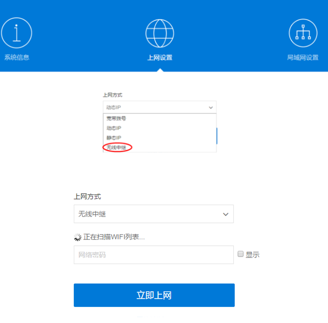 补充:有的路由器他没有直接的这个桥接应用,那么我们在拿它做无线桥接时,直接选择他的上网方式为:无线中继。立即开始扫描附近的wifi信号,就行了,其它的步骤是一样的。