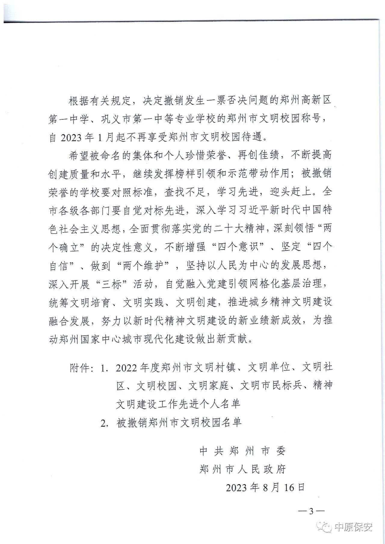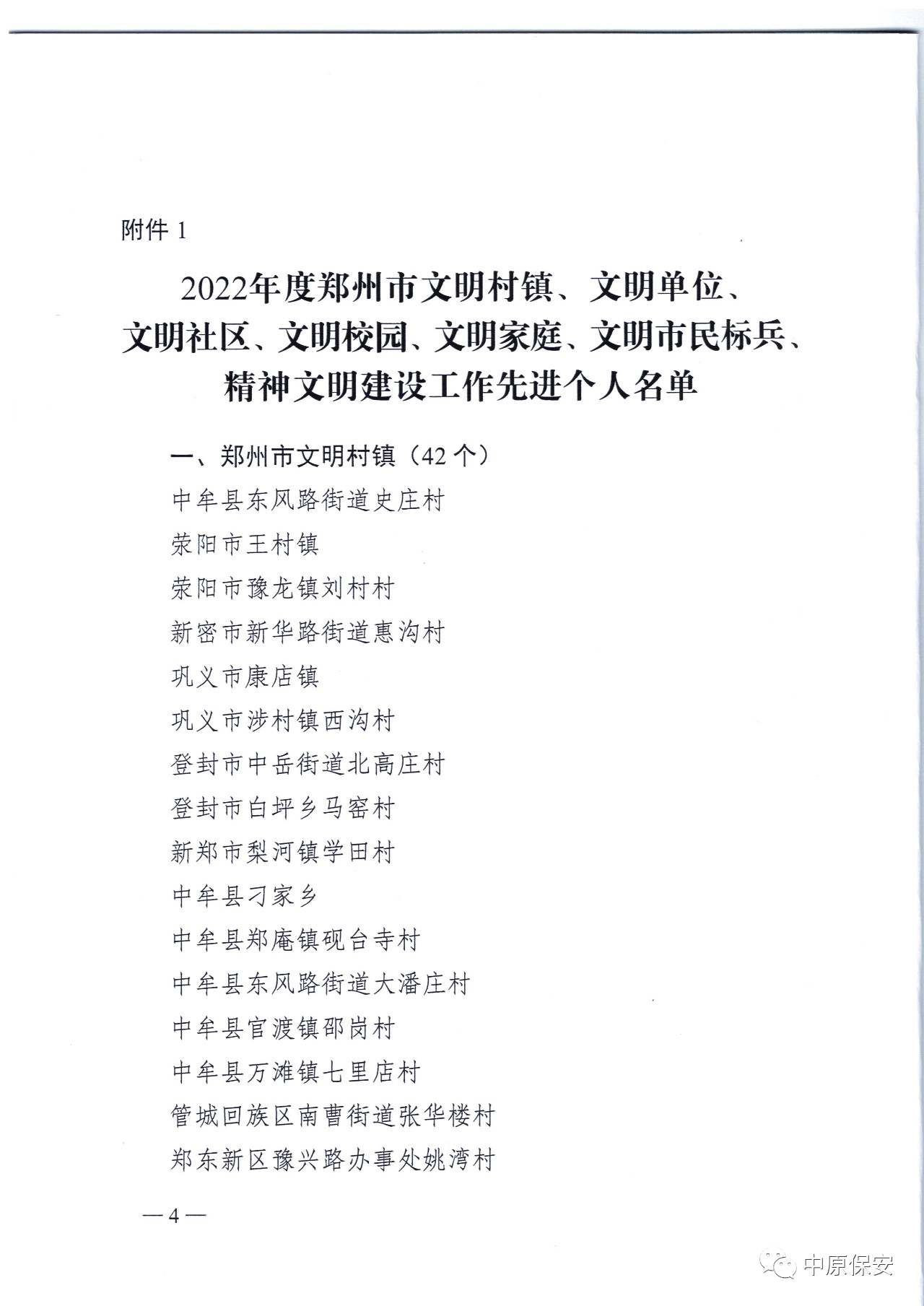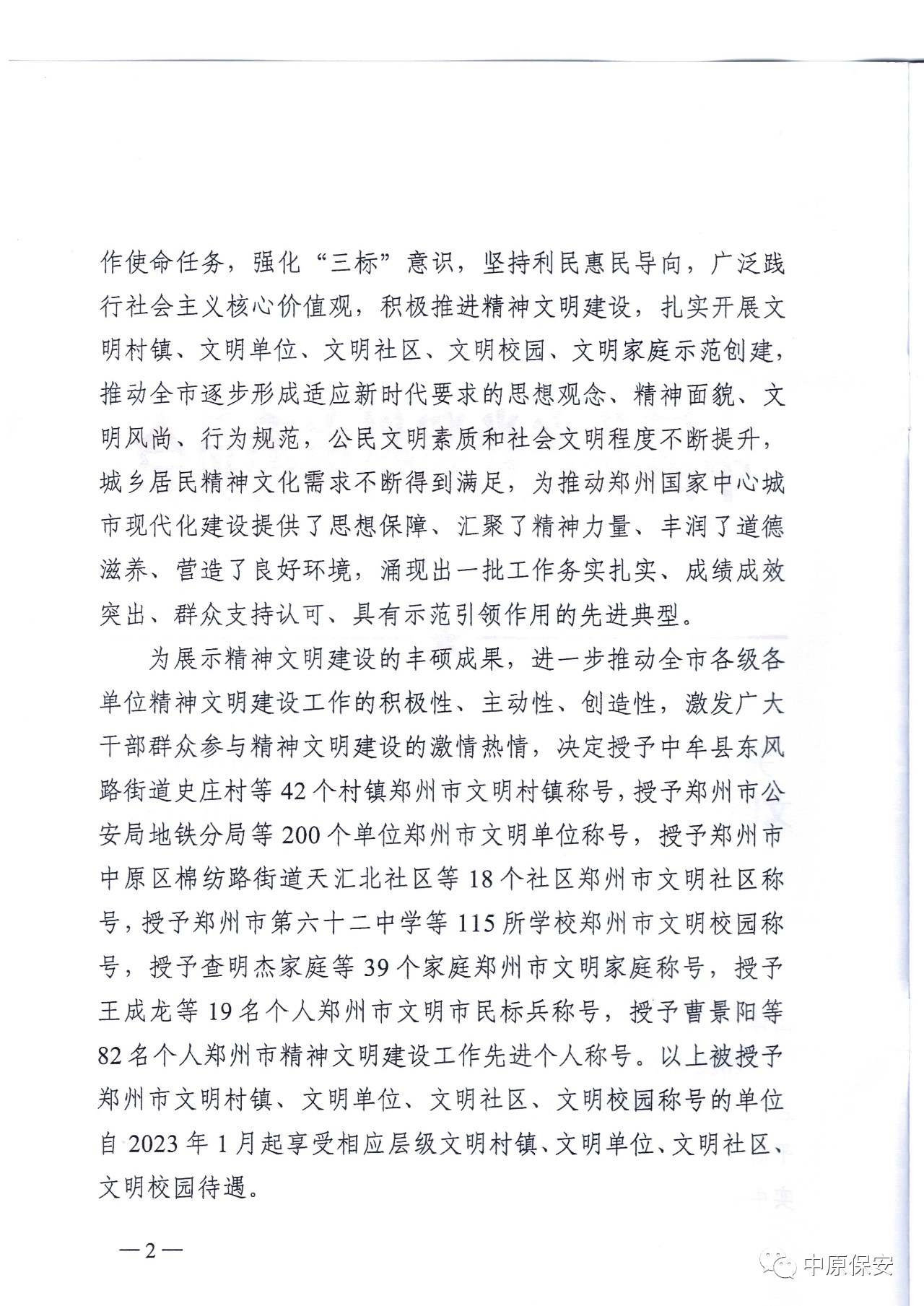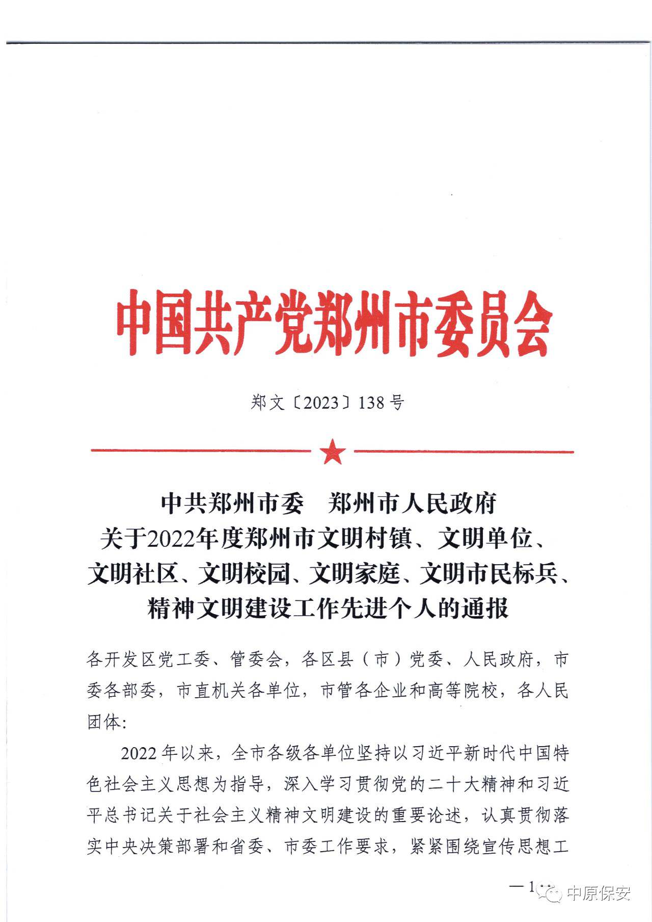 日前,郑州市委、市政府印发了《中共郑州市委郑州市人民政府关于2022年度郑州市文明村镇、文明单位、文明社区、文明校园、文明家庭、文明市民标兵、精神文明建设工作先进个人的通报》,郑州市中原保安服务有限公司荣获“郑州市文明单位”称号,标志着中原保安公司精神文明建设工作取得了新成果、再上新台阶。