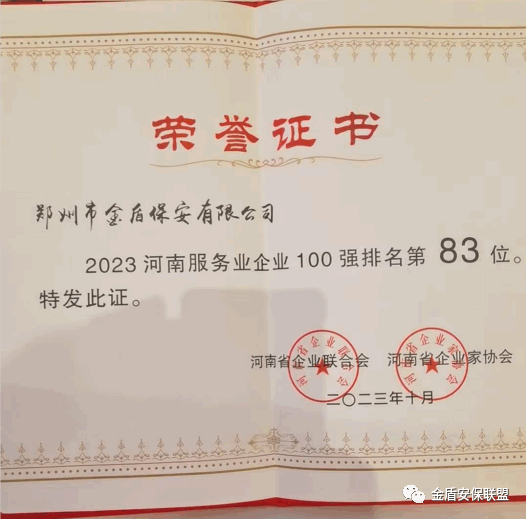 10月27日,“2023河南企业100强高峰会”在开封召开。今年是河南省企联在企业自愿申报的基础上,按照国际通行方式,以企业营业收入为入围标准,连续第18年发布河南企业100强榜单,连续第3年发布河南制造业企业100强、河南服务业企业100强榜单。郑州市金盾保安有限公司在2023河南服务业企业100强排名位列第83位。