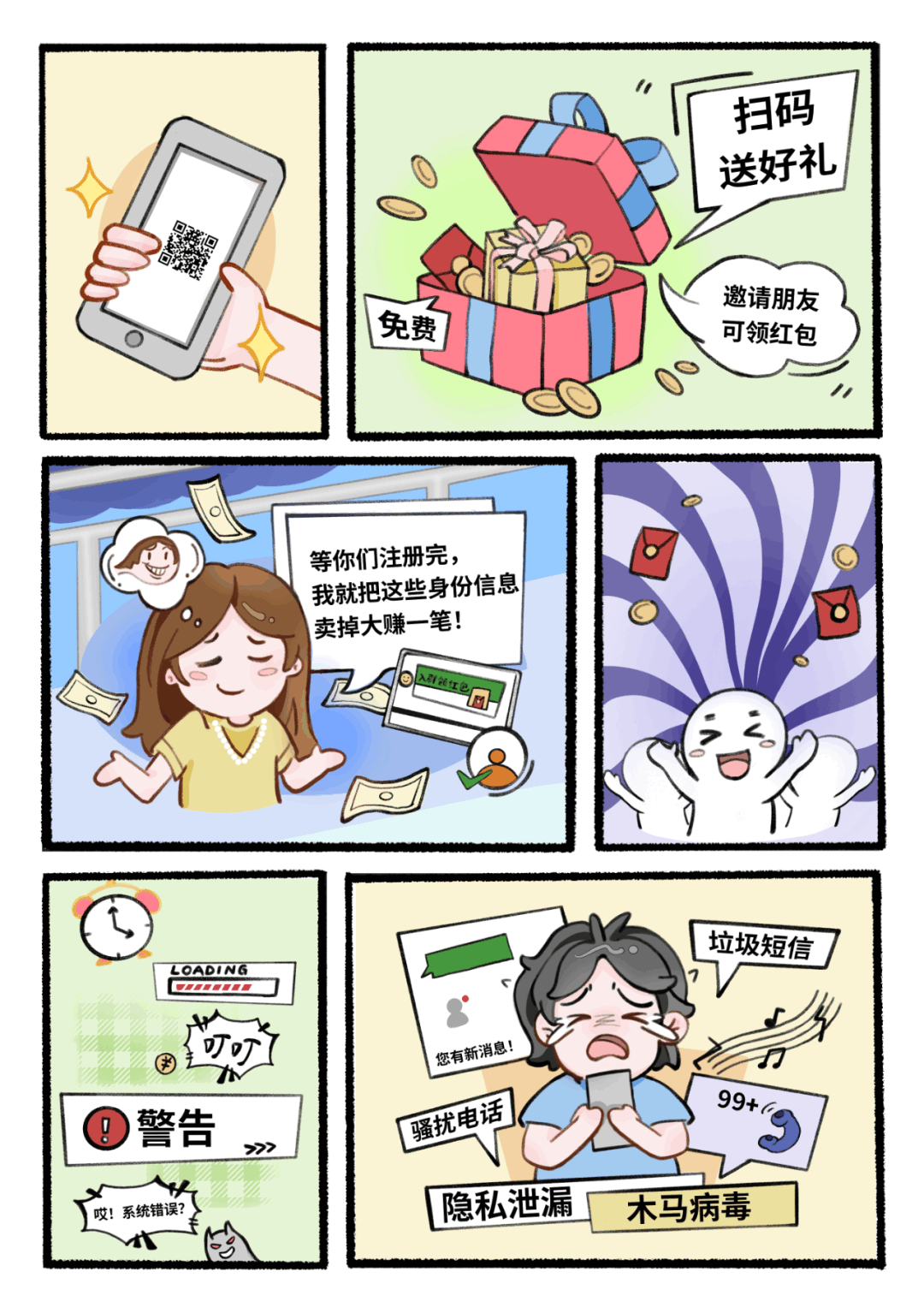 请勿随意扫描陌生二维码,警惕二维码陷阱,不点击可疑链接,避免信息泄露,切勿因蝇头小利遭受不必要的财产损失。