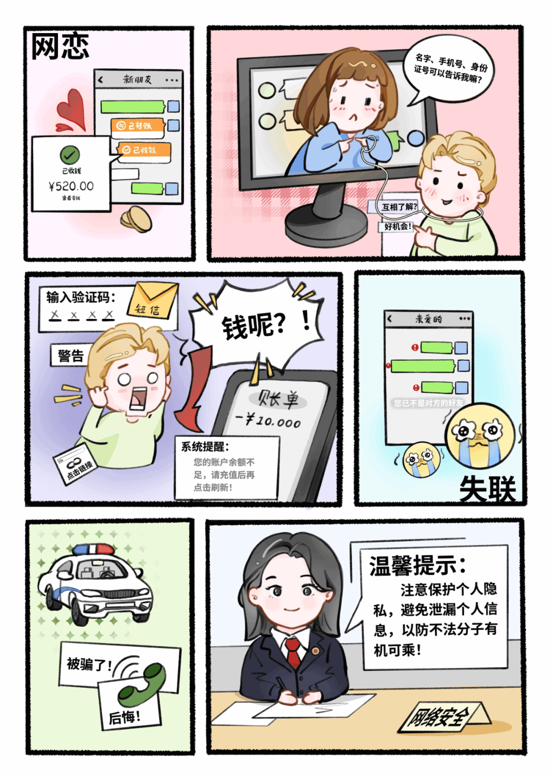 不要轻易添加陌生人QQ、微信,更不要轻易向对方转账汇款,注意保护个人隐私,请勿将自己的身份证号码、银行卡等隐私信息透露给他人,避免成为犯罪分子的帮凶。