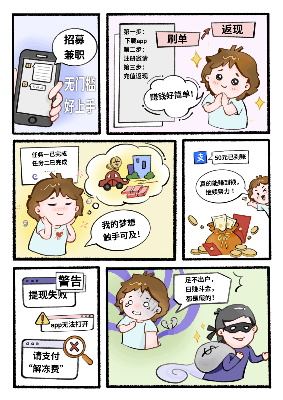 刷单是违法行为,请勿相信任何刷单返利的广告。兼职工作时要擦亮双眼,提高自我保护意识,避免落入诈骗陷阱。