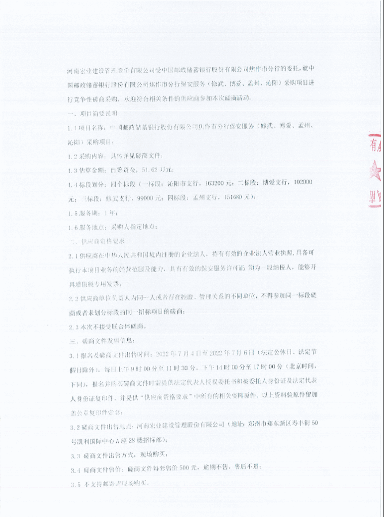 中国邮政储蓄银行股份有限公司焦作市分行保安服务(修武、博爱、孟州、沁阳)采购项目竞争性磋商公告