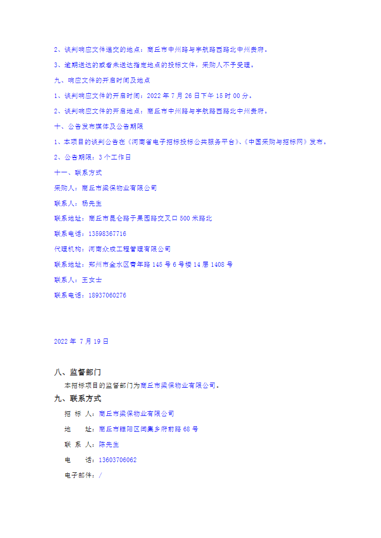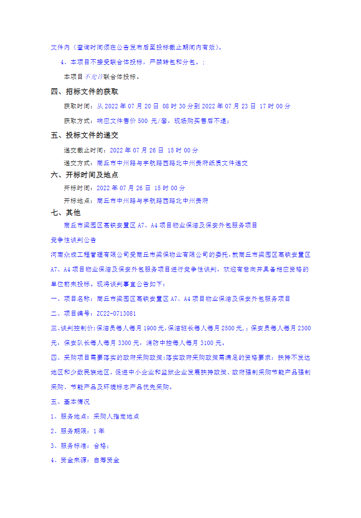 商丘市梁园区高铁安置区A7、A4项目物业保洁及保安外包服务项目竞争性谈判公告