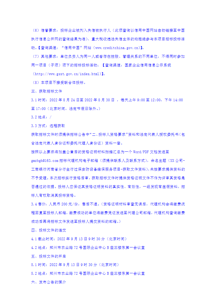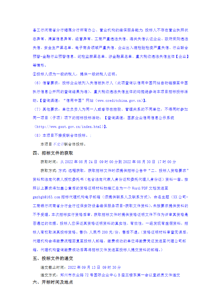 中国工商银行股份有限公司河南省分行全行过保安防设备维保服务项目招标公告
