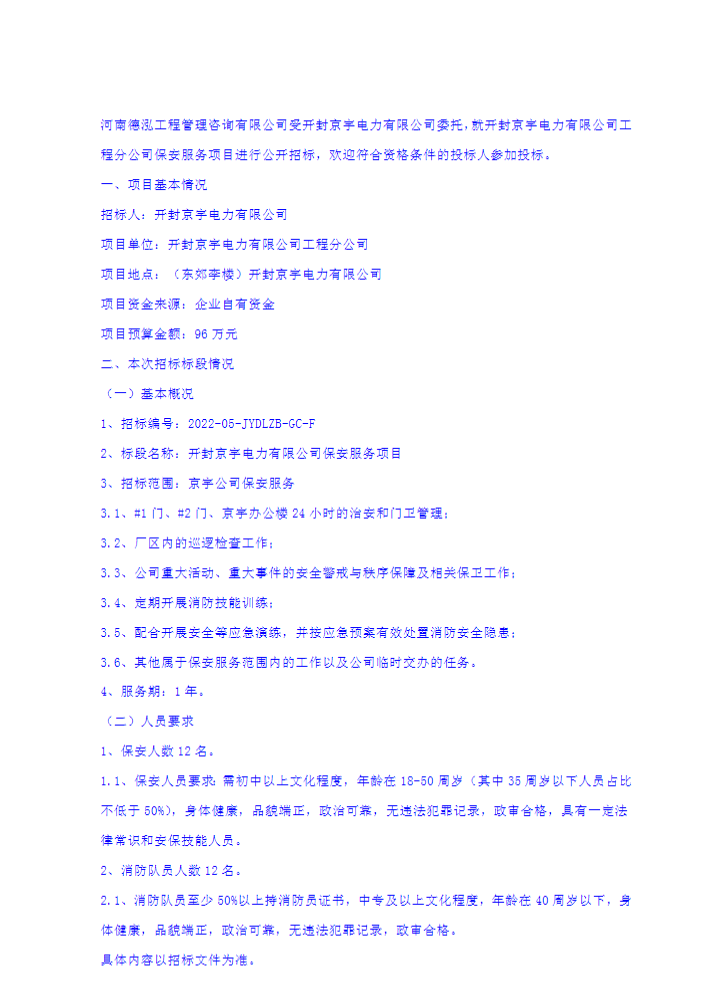 开封京宇电力有限公司保安服务项目招标公告