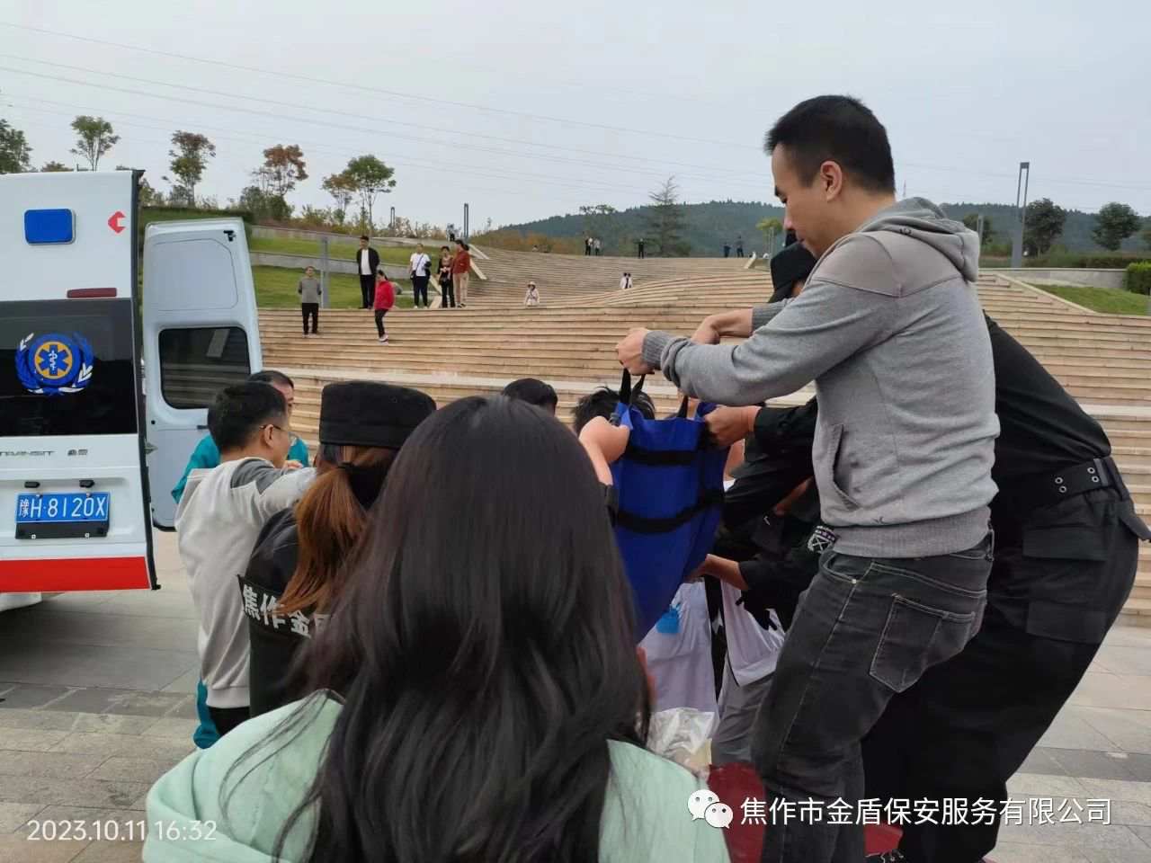 10月11日16时许,人防六部驻南太行花海公园执勤岗点保安员巡逻时发现一名游客不慎摔倒,腿部严重受伤。保安员李佳美发现后,立即向岗点负责人汇报,随后联系其他保安队员前去帮忙。因是山路,救护车上不去,队