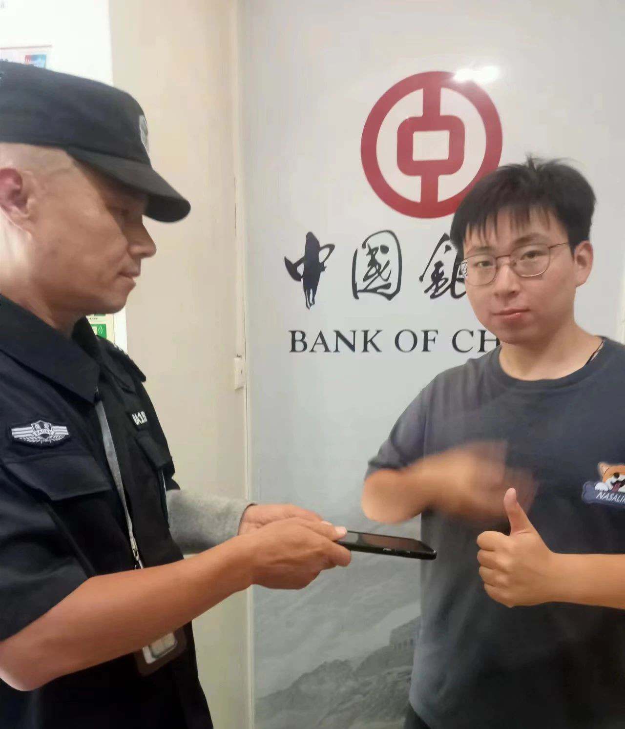 8月31日12时40分,人防三部五区驻中国银行焦作分行保安员邱小松在ATM自助取款区例行检查时,发现地上有一部手机,附近并无他人。邱小松将手机收起,并马上将情况汇报给大堂经理。经过多次联系,最终将手机