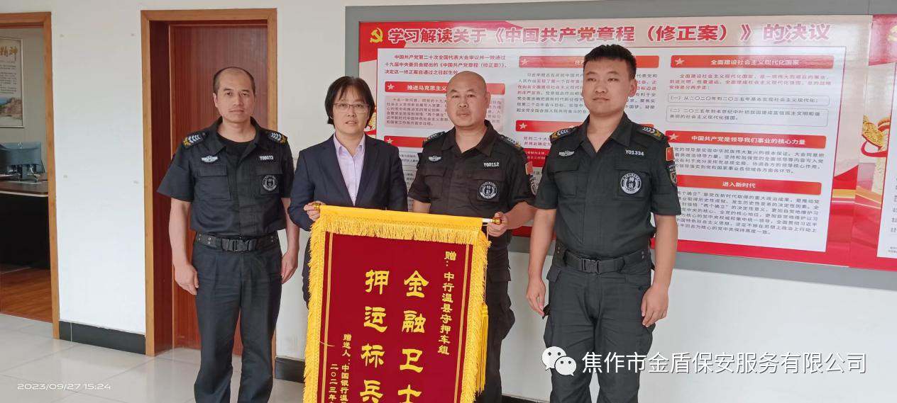 9月27日,押运部中行温县守押车组收到了一面由刘冬霞副行长送来的绣着“押运标兵金融卫士”的锦旗,对本车组优质、高效、快捷的守押勤务工作给予了较高的评价和肯定。 中行温县车组是较远的县区车组,多年来车组