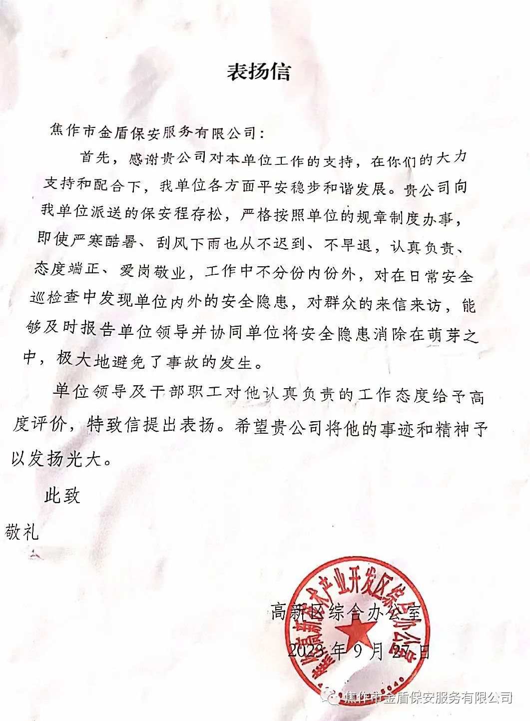 日前,南阳市保安服务公司接到南阳市某医院热情洋溢的一封感谢信和一面写着“不惧危险 勇往直前 尽职尽责 保医院平安” 的锦旗。信中写到,“......代表医院向贵公司李永哲、陈守付、易豪、雷春伟、丁大勇