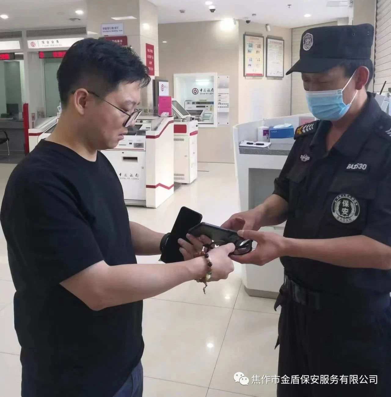 5月22日8时,人防三部五区驻中国银行塔南支行保安员王玉备到岗点进行早接款例行巡查,刚到支行门口就发现门前台阶上放着一部手机及一幅眼镜,附近并无他人。保安员王玉备将物品收起后,马上将这情况汇报给大堂经