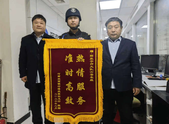 2月24日,河南农商银行博爱寨豁支行将一面印有“热情服务、准时高效”的锦旗送到了焦作金盾解放守押大队六号车组,对其长期以来专业、高效、可靠的守押服务表示高度认可和衷心感谢。 在日常业务合作中,解放守押