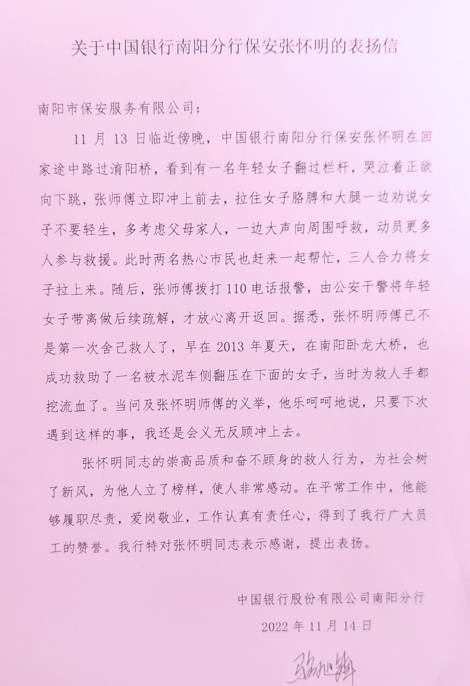 11月14日,中国银行南阳分行发给南阳市保安服务公司一封表扬信《关于中国银行南阳分行保安张怀明的表扬信》,信上说,“张怀明同志的崇高品质和奋不顾身的救人行为,为社会树立了新风,为他人树立了榜样,(他的