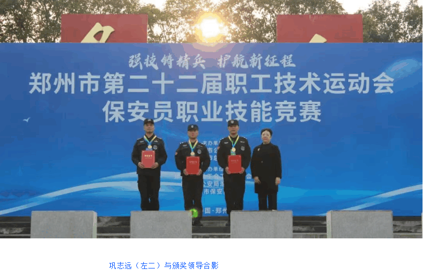 11月4日,由郑州市公安局、郑州市总工会主办的“强技铸精兵,护航新征程”郑州市第二十二届职工技术运动会保安员职业技能竞赛圆满落幕。在这场全市范围的行业竞技中,郑州市中原保安服务有限公司员工巩志远沉着应