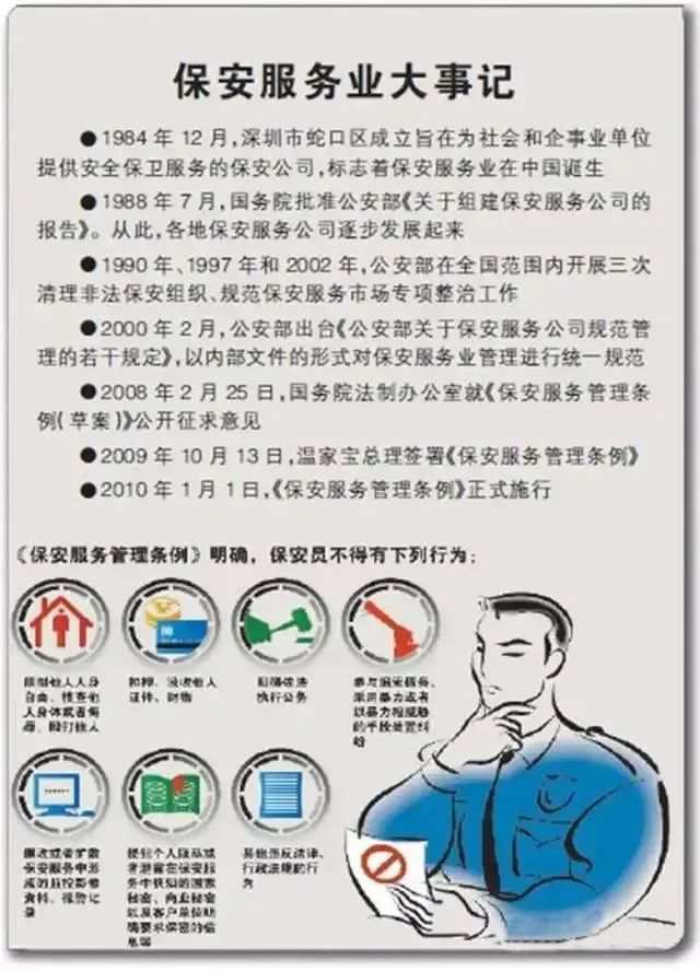 1984年第一家保安公司在深圳蛇口成立,保安服务业经过30多年的发展,2015年底全国保安从业人员已达500多万。保安服务业直接参与维护社会治安,成为人民群众安全感的重要守护者。每年全国两会、APEC