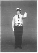 3.左转弯手势——准许车辆左转弯 (1)右臂向前平伸与身体呈90度,掌心向前,手掌与手臂夹角不小于60度,五指并拢,面部及目光同时转向左方45度。 (2)左臂与手掌平直向右前方摆动,手臂与身体呈45度