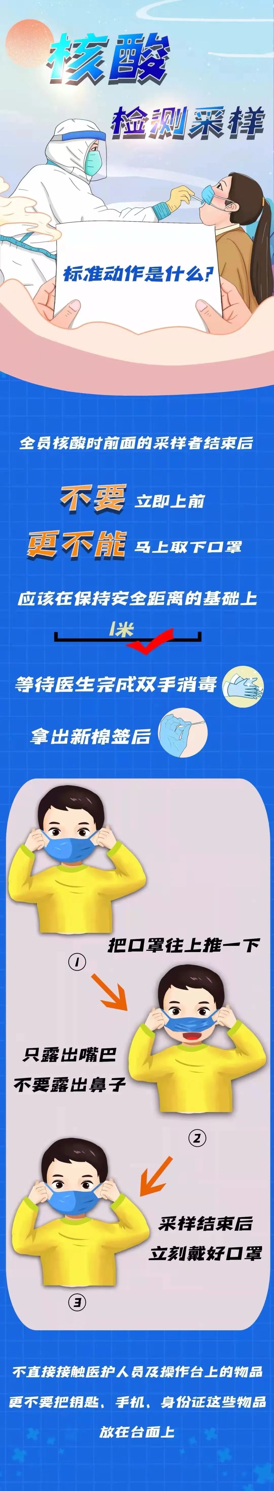 核酸检测采样“正确姿势” (一)采样站位 在面对面进行口咽试采样时,建议被采样人员以45—60度的角度呈斜向站立,以降低采样人员的感染风险。 (二)采样时不要喊“啊” 在做核酸检测时,有的被采样者张嘴