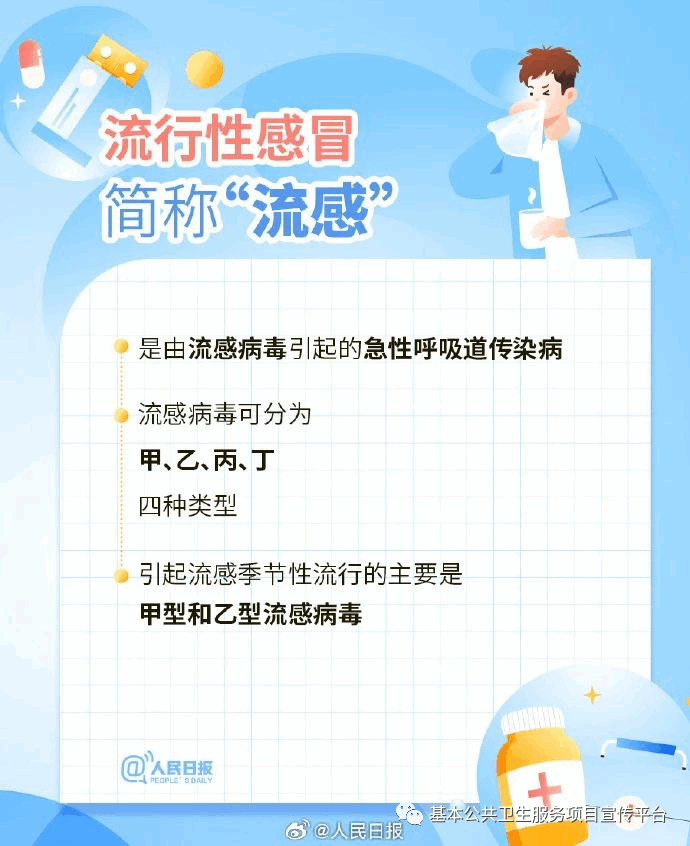 什么是流感? 流行性感冒,简称“流感”,是由流感病毒引起的一种传染性强、传播速度快的急性呼吸道传染病。 流感病毒分为甲、乙、丙、丁四型,目前感染人的主要是甲型流感病毒中的H1N1、H3N2亚型及乙型流