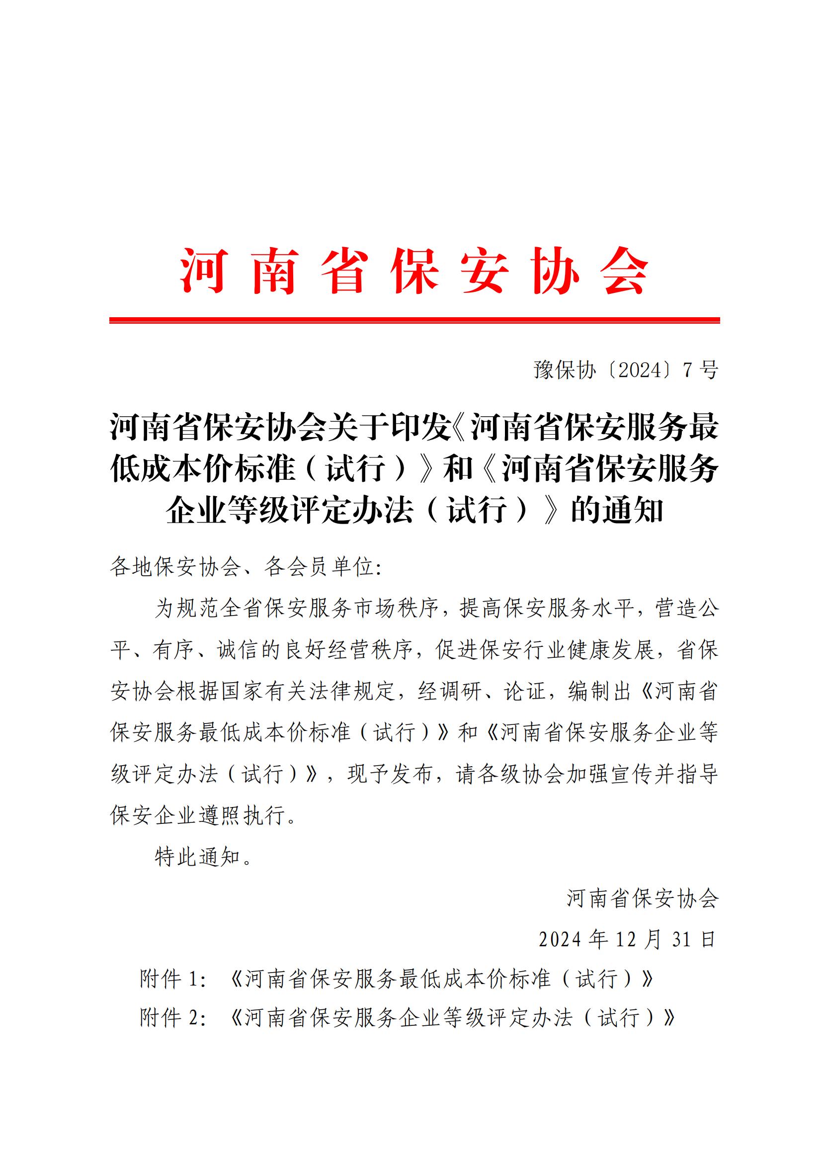 附件1:《河南省保安服务最低成本价标准(试行)》.docx 附件2:河南省保安服务企业等级评定办法(试行).doc 河南省保安服务企业等级评定标准.xlsx