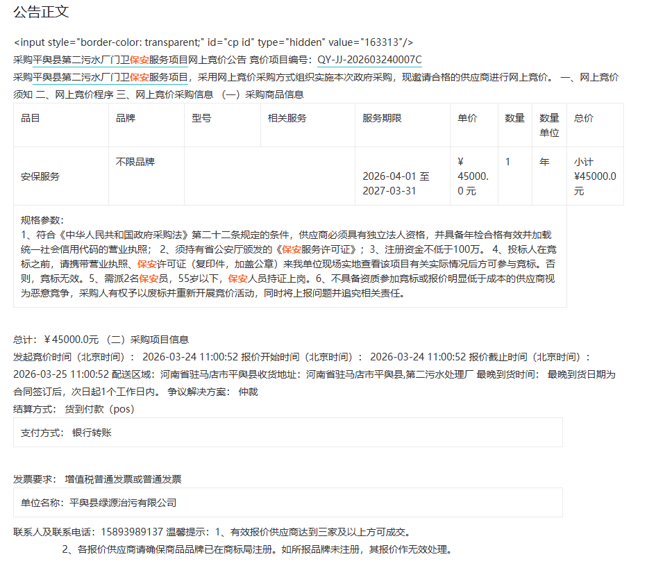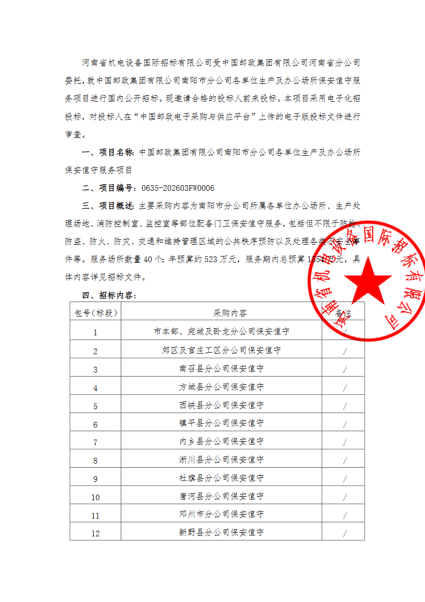 河南省机电设备国际招标有限公司受中国邮政集团有限公司河南省分公司委托,就中国邮政集团有限公司南阳市分公司各单位生产及办公场所保安值守服务项目进行国内公开招标。现邀请合格的投标人前来投标。本项目采用电子